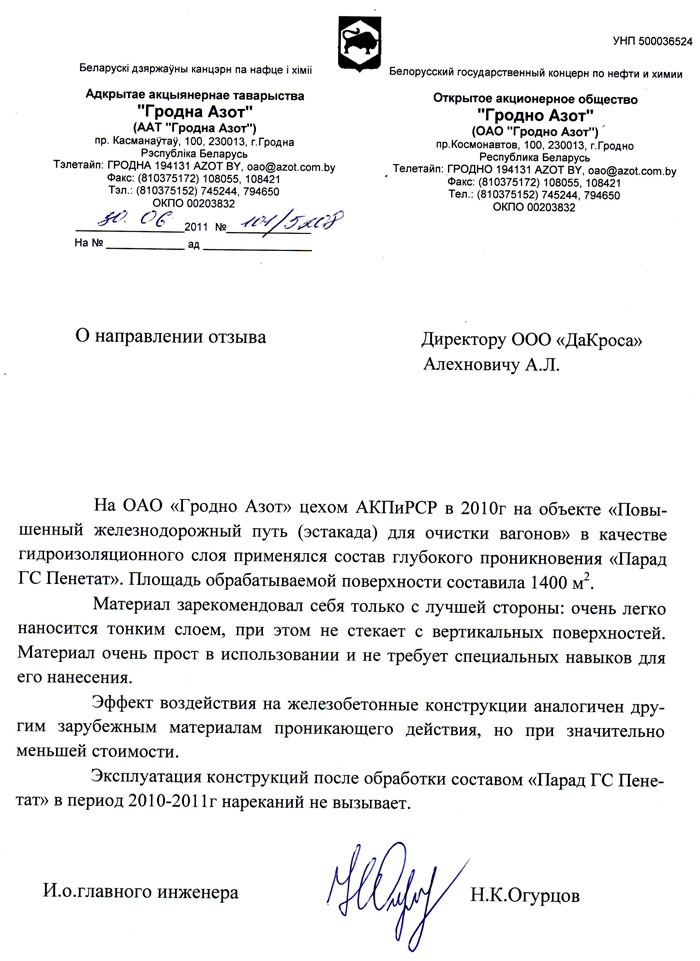 На ОАО «Гродно Азот» цехом АКПиРСР в 2010 г. на объекте «Повышенный железнодорожный путь (эстакада) для очистки вагонов» в качестве гидроизоляционного слоя применялся состав глубокого проникновения «Парад ГС Пенетрат». Площадь обрабатываемой поверхности составила 1400 м2.